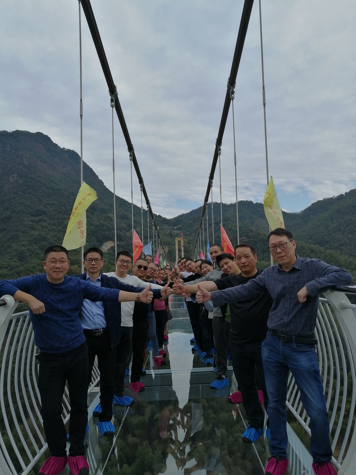16日一早陽(yáng)光明媚,在一路的歡歌笑語中,大家首先來到了“人在橋上走,景在底下游”的廬山西海9D玻璃橋。 此橋凌駕于峰巒疊嶂的兩山之間,全程用透明玻璃構(gòu)成,全長(zhǎng)398米最高落差108米寬2米,遠(yuǎn)遠(yuǎn)望之仿佛隱形于叢林之中,站在玻璃天橋上有步入云端的感覺,玻璃橋中段還有震撼9D效果,輕輕一踩玻璃便在腳下爆碎蔓延,逼真刺激的破碎聲音咔咔咔地在耳邊響起。這使得團(tuán)隊(duì)里多名恐高隊(duì)友,一開始都覺得這是不可能跨越的鴻溝,紛紛打起退堂鼓。但在同事們的再三鼓勵(lì)下,最終克服恐懼,戰(zhàn)勝自己!通過玻璃棧道后大家回程嘗試了廬山西海9D玻璃滑道,全長(zhǎng)518米的雙道雙滑玻璃滑道,不僅周圍風(fēng)光一覽無余,更切實(shí)感受了一把速度與激情。