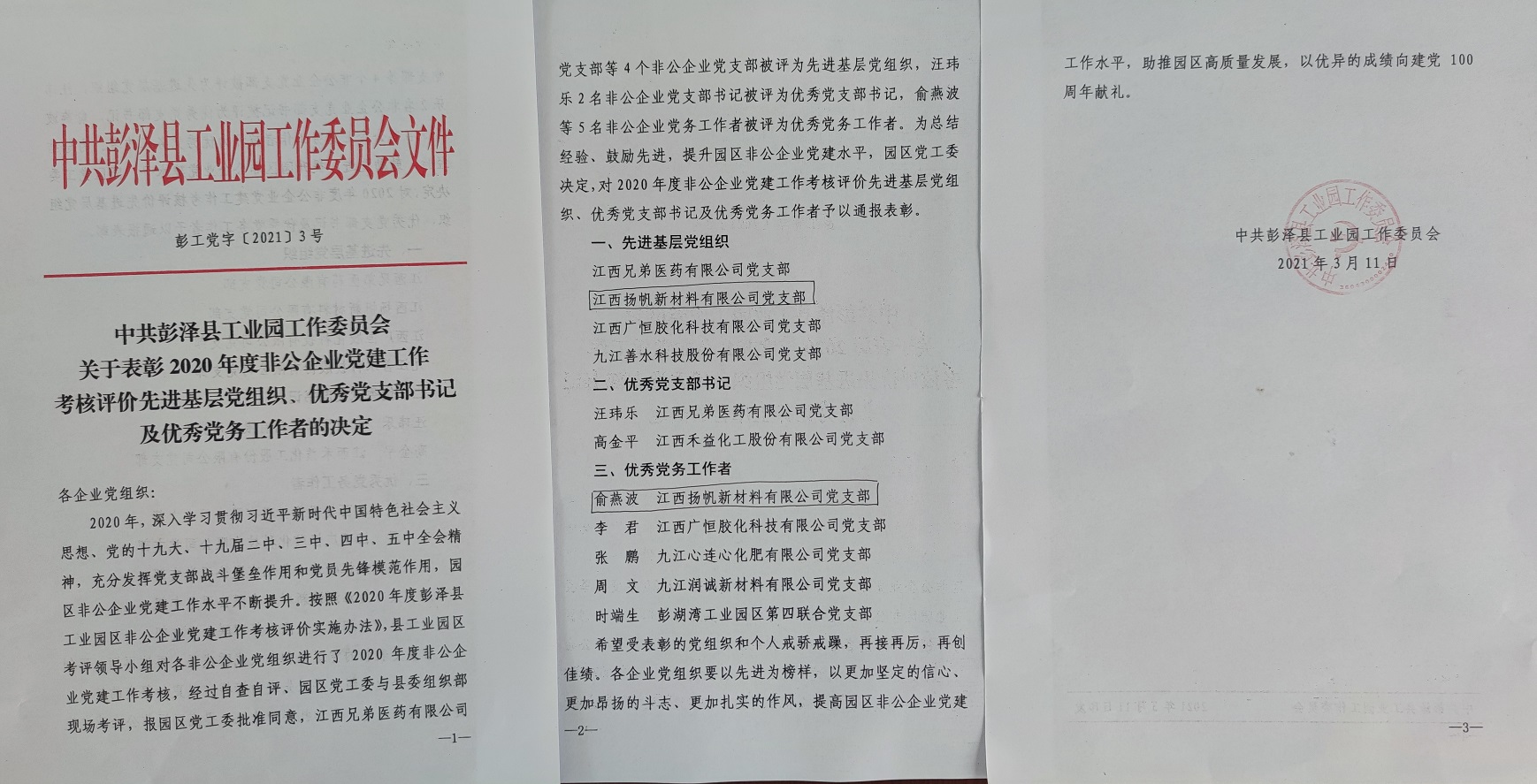 3月11日,園區(qū)召開2020年度非公企業(yè)黨建述職暨2021年非公黨建工作部署會(huì),會(huì)上表彰了2020年度非公企業(yè)先進(jìn)基層黨組織、優(yōu)秀支部書記、優(yōu)秀黨務(wù)工作者,我公司支部榮獲2020年度先進(jìn)基層黨組織榮譽(yù)稱號(hào),園區(qū)僅4家企業(yè)支部獲此榮譽(yù),同時(shí)支部俞燕波同志被評(píng)為優(yōu)秀黨務(wù)工作者。