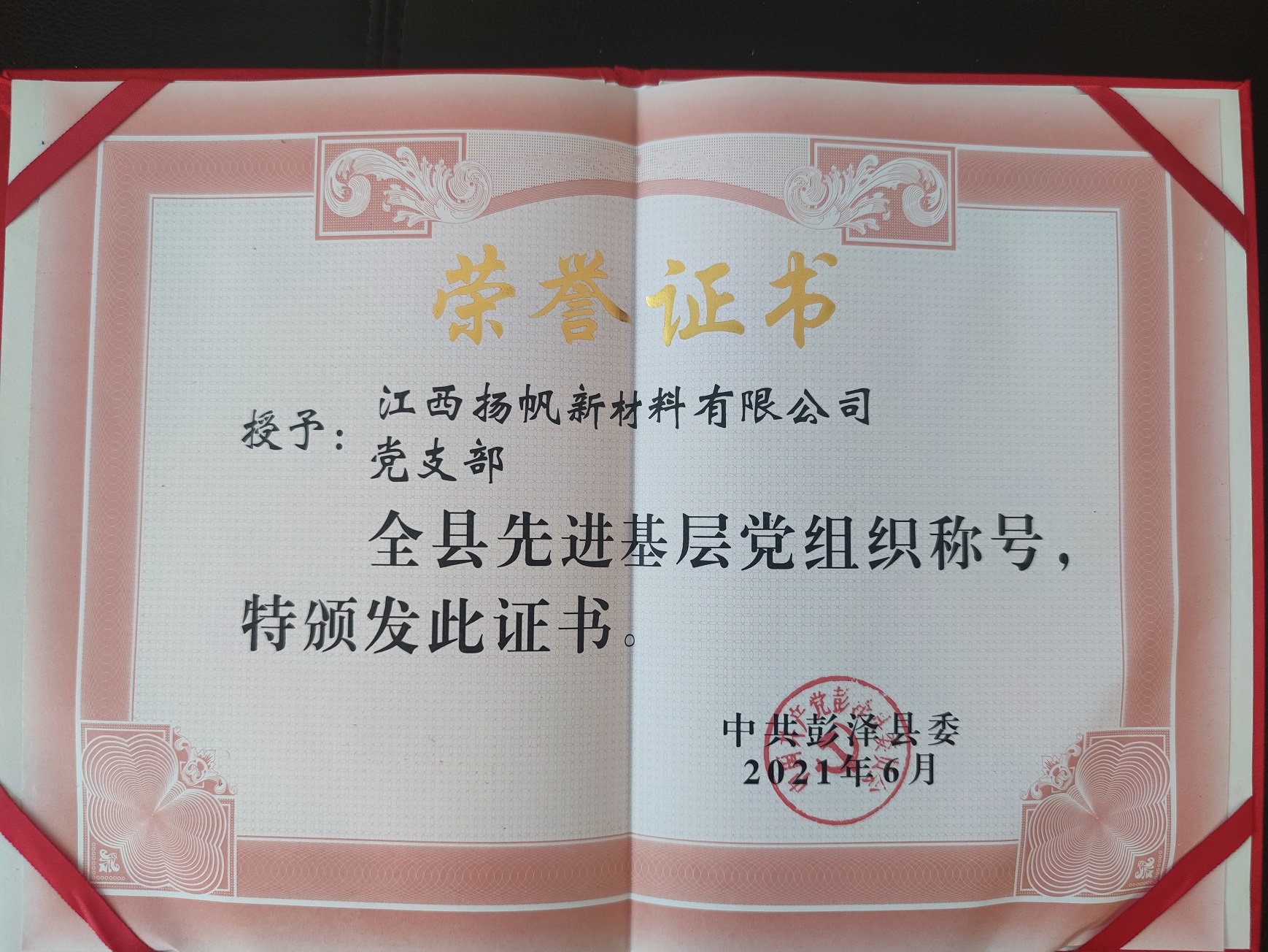 近日,為慶祝建黨100周年,中共彭澤縣委做出關(guān)于《表彰彭澤縣優(yōu)秀共產(chǎn)黨員、優(yōu)秀黨務(wù)工作者和先進(jìn)基層黨組織的決定》。江西揚(yáng)帆新材料有限公司黨支部榮獲“全縣先進(jìn)基層黨組織”榮譽(yù)稱(chēng)號(hào)。