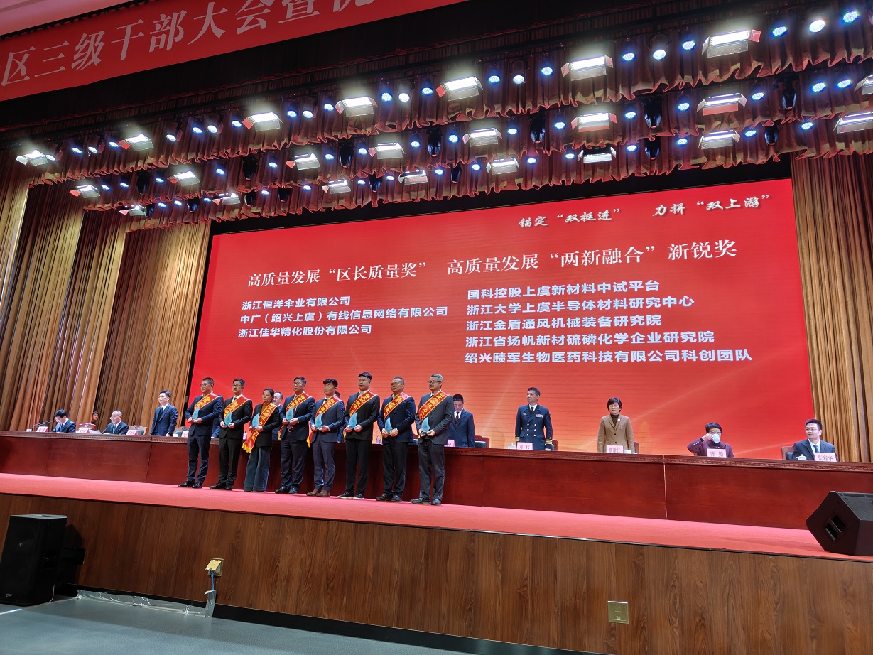 揚(yáng)帆新材料(浙江)股份有限公司樊彬董事長(zhǎng)、陶明總裁參會(huì)并登臺(tái)領(lǐng)獎(jiǎng)。公司憑借2025年優(yōu)異表現(xiàn),榮獲2025年度高質(zhì)量發(fā)展突出貢獻(xiàn)獎(jiǎng),樊彬董事長(zhǎng)上臺(tái)受獎(jiǎng);同時(shí),揚(yáng)帆新材下屬省級(jí)企業(yè)研究院斬獲高質(zhì)量發(fā)展“兩新融合”新銳獎(jiǎng),由陶明總裁登臺(tái)領(lǐng)獎(jiǎng)。