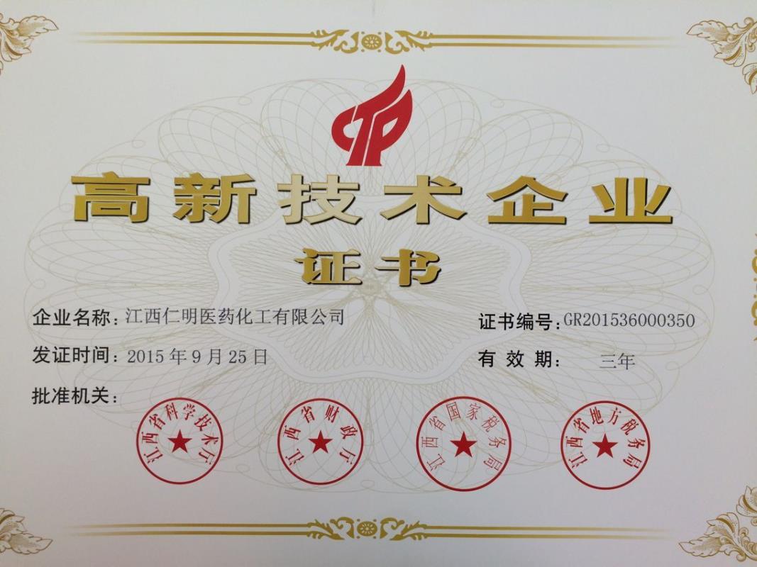 根據國家科技部、國家財政部、國家稅務總局《高新技術企業認定管理辦法》(國科發火[2008]172號)、《高新技術企業認定管理工作指引》(國科發火[2008]362號)文件規定及全國高企業認定工作辦公室《關于江西省2015年第一批高新技術企業備案的復函》(國科為字[2015]237號)文件,江西仁明醫藥化工有限公司經審查通過并認定為高新技術企業,證書編號為GR201536000350。